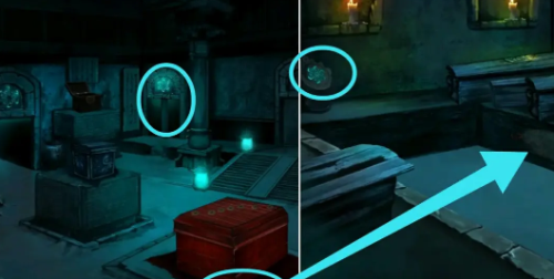 7、用怪石打开左侧墓室水池底的箱子,获得七星钉魂阵,查看提示后打开大厅红箱,激活暗门进入下一章。