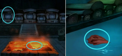 5、进入右侧墓室,打开第二口棺材取出长棍和一段破衣。然后到左侧墓室把衣服放进水池,用长棍缠绕后返回右侧墓室,从火池中获得蓝色钥匙。