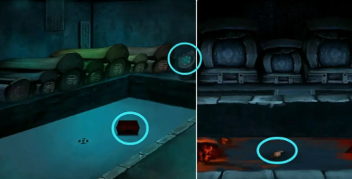 6、把蓝色钥匙插入左侧墓室的石柱,待水池排干后取出池底的红钥匙。然后去右侧墓室将钥匙插入石柱,获得火池底下的怪石。