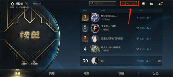 2、进入排行功能后,点击顶部的“好友箭头”按钮。