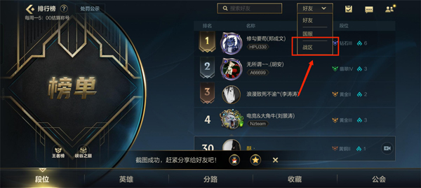 4、进入战区界面后,顶部会显示“战区下拉条”,我们在这里找到自己所在的“战区”位置。