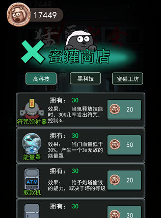 2、打完一局给蜜獾币,攒着去商店买永久道具。这些装备开局就能带,不花游戏里的金币闪电。建议先买加攻速的,前期发育快人一步。氪佬直接拉满,虐鬼更轻松。