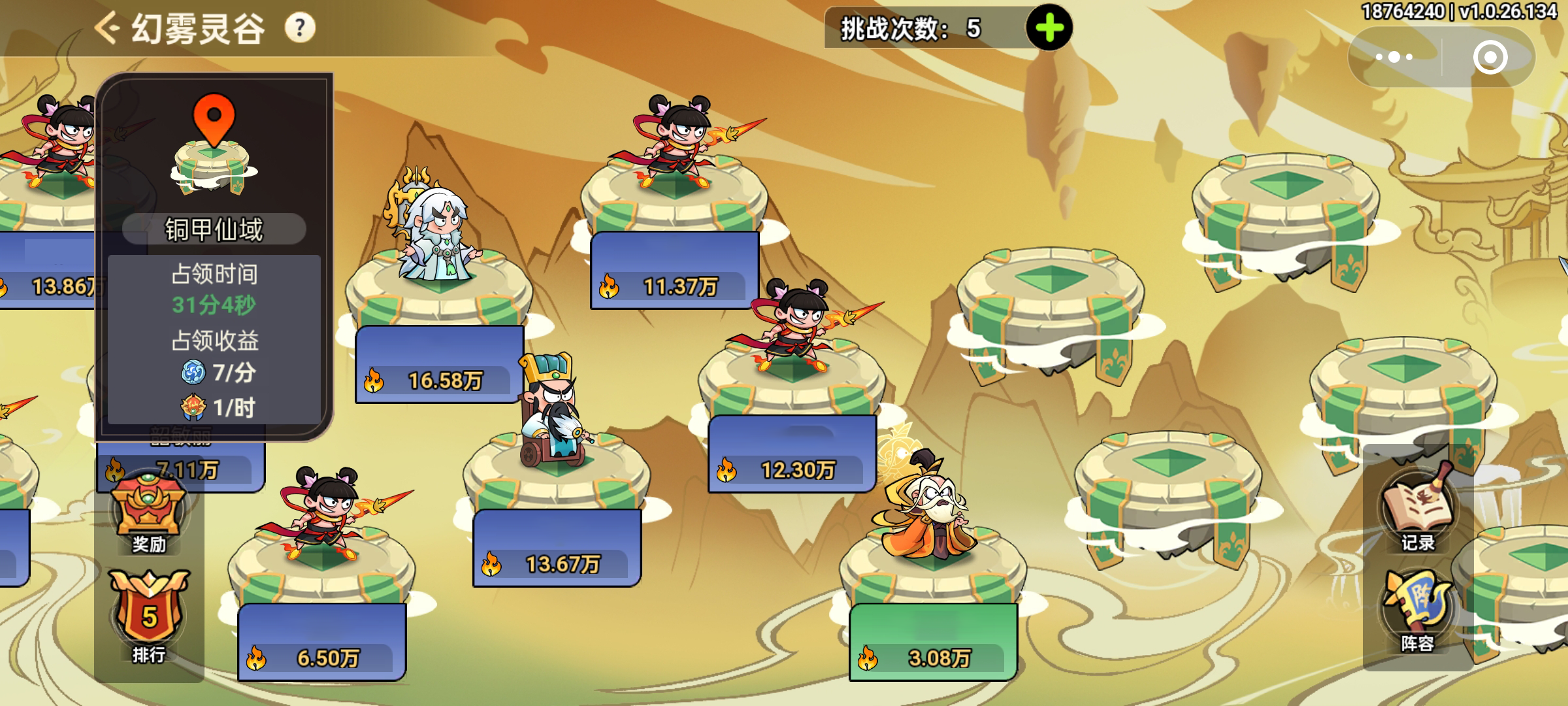 7、幻雾灵谷抢的地盘品级越高,每小时收益越多。占完有1小时保护期,记得优先抢高级地盘。别抢自己人的地,要团结才能拿盟排名奖励。
