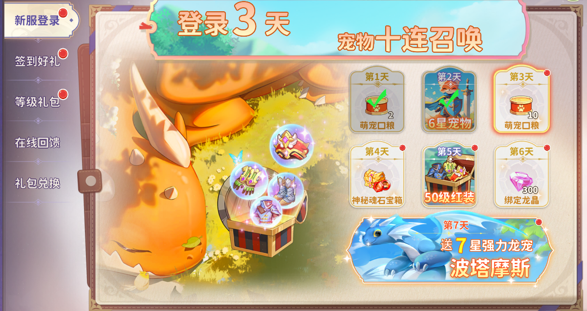 2、坚持每日登录,即刻领走丰厚奖励,登录5天送自选红色装备,登录7天送顶级龙宠-水龙波塔摩斯。