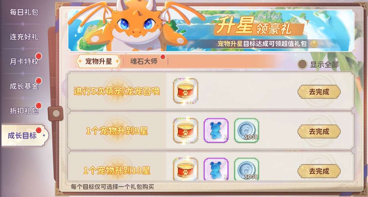5、活动期间内进行宠物升星以及镶嵌魂石,达到对应标准就可以领取超多免费礼包哦。