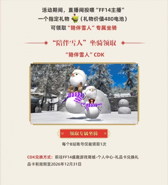 3、观众投喂【玉米大人】480电池即可获得领取坐骑【陪伴雪人】的资格。