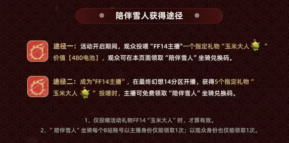 最终幻想14:水晶世界坐骑陪伴雪人怎么获得呢?获取方式跟B站活动挂钩,主播收到5个玉米大人礼物,或者观众刷480电池的玉米大人,就能领到这个坐骑。具体要去光之创作狂欢节页面参加,活动时间有限想拿的抓紧。游戏里直接兑换,雪人坐骑能带着到处跑挺拉风的。