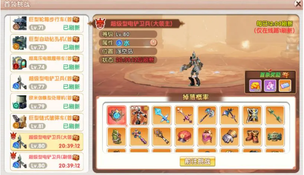 5、打高级BOSS是搞传说装备的主要路子,特别是开服前30天还能拿首爆奖励。金币、钻石、卡片箱这些好东西都能白嫖,首杀奖励只要参与就有份。不过要注意掉落归属看最后一刀,经常有人蹲着抢尾刀。东西掉出来记得赶紧捡,过时不候。BOSS界面左边能看到刷新倒计时,大领主只在1线固定时间刷。建议提前组好队蹲点,散人玩家最好避开高峰期,不然容易给别人打工。高级BOSS爆的装备属性爆炸,但难度也大,没成型前别去送人头。