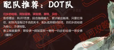 2、推荐理由:BUFF伤害,回合拖得越久,累计输出越高,只要扛得住,时限内没有过不去的关卡,配队成本相对较低,且归乡的哈缇为核心,方便转型。