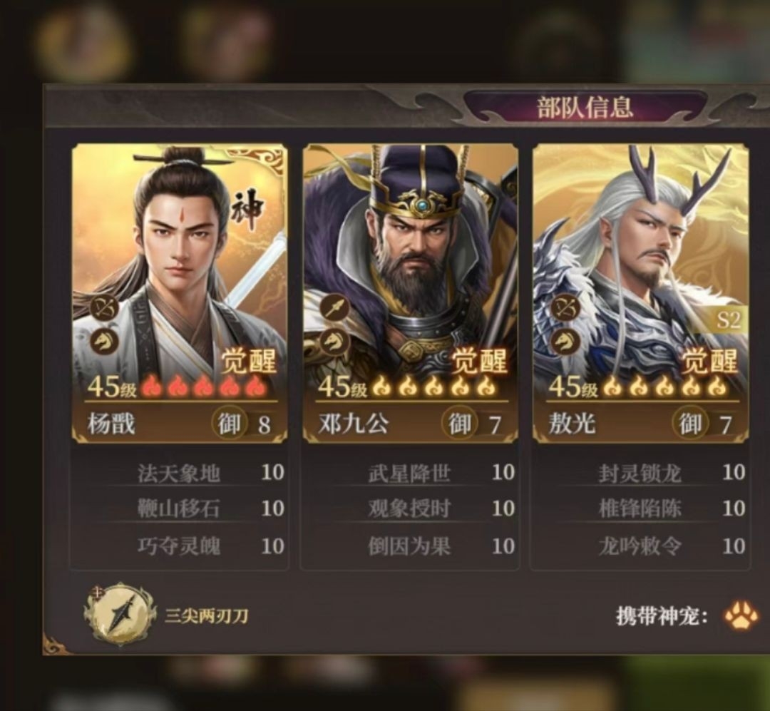 1、骑兵天花板阵容就是杨戬敖光邓九公组合,三个猛男冲起来根本拦不住。敖光带追击增伤,杨戬武力值越打越高,邓九公连击追着砍。技能推荐鞭山移石加观象授时,输出爆炸还能控场。龙吟敕令配椎锋陷陈,移精变气保续航。这套打起来特别无脑,见面就是冲脸,脆皮阵容直接秒。注意别被枪兵阵容针对就行,遇到控制流要调整走位。