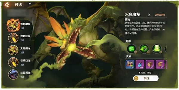 1、灭息魔龙:始终盘旋在巢穴上方的剧毒飞龙,攻击性极强,可喷吐毒液对敌军造成大范围伤害。推荐上阵具备对空能力的英雄与士兵,除此之外,需要安排能抗伤的前排单位抵挡攻击。