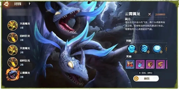 3、云霄翼龙:拥有两个头颅的巨型飞龙,能借助高超的飞飞行技巧与控制气流的能力在险峻的山崖之间快速穿梭,擅长控制风暴攻击并击飞飞敌军。推荐上阵具备对空能力的英雄与士兵,除此之外,需要安排能抗伤的前排单位抵挡攻击。