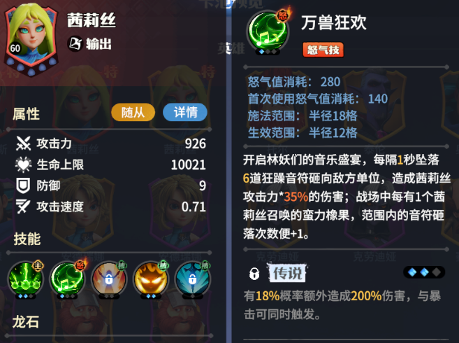 1、茜莉丝被誉为万兽之灵,是常驻卡池中的后排输出角色。她的怒气技能每秒能向敌人落下六道音符,伤害与其攻击力相关。此外,战场上每有一个茜莉丝的橡果,音符的落下次数将增加一次。推荐搭配“共生契约”套装,站在后排的她可以充分利用召唤技能。当召唤物造成伤害时,使用者能恢复一定生命值,而使用者攻击时则为召唤物提供治疗,整个队伍因此具备良好的续航能力。