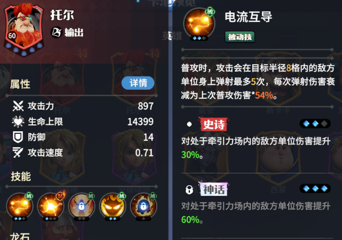 3、托尔是一个优秀的输出角色,被动普攻能在敌人之间弹射,每次弹射的伤害有所减弱。其怒气技能为牵引立场,可以向敌方上空发射吸力球,将范围内敌人吸引至球中心,并在持续7秒内定期造成与攻击力相关的伤害。托尔的输出能力极高,但相对脆弱,堪称玻璃大炮。因此,适合配置前排和辅助以确保其生存,从而营造良好的输出环境。推荐搭配决斗时刻套装,以提升怒气值和输出频率,提高整体战斗能力。