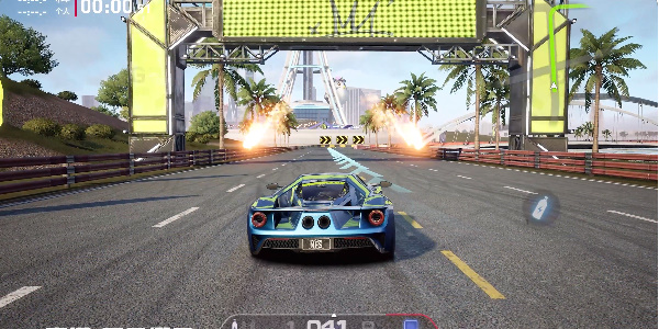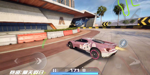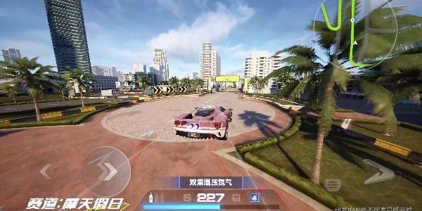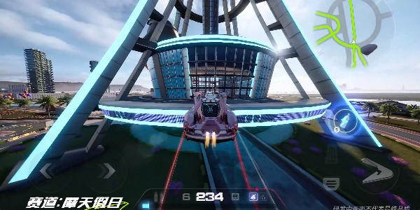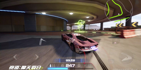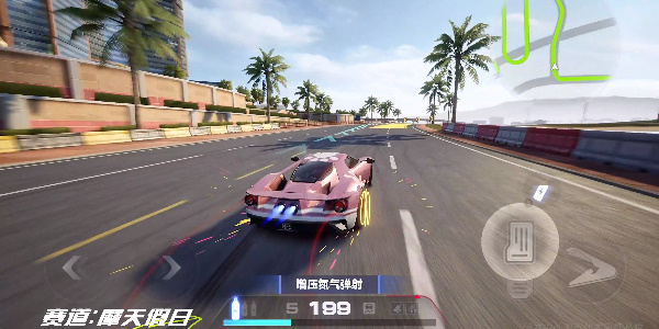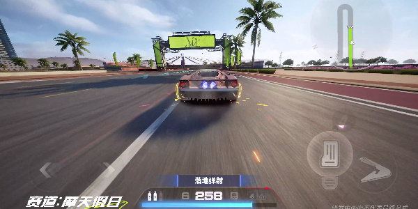 3、根据指示牌的指引进行拐弯,拐弯结束后利用油门弹射的技能加足马力,使劲向前冲刺。