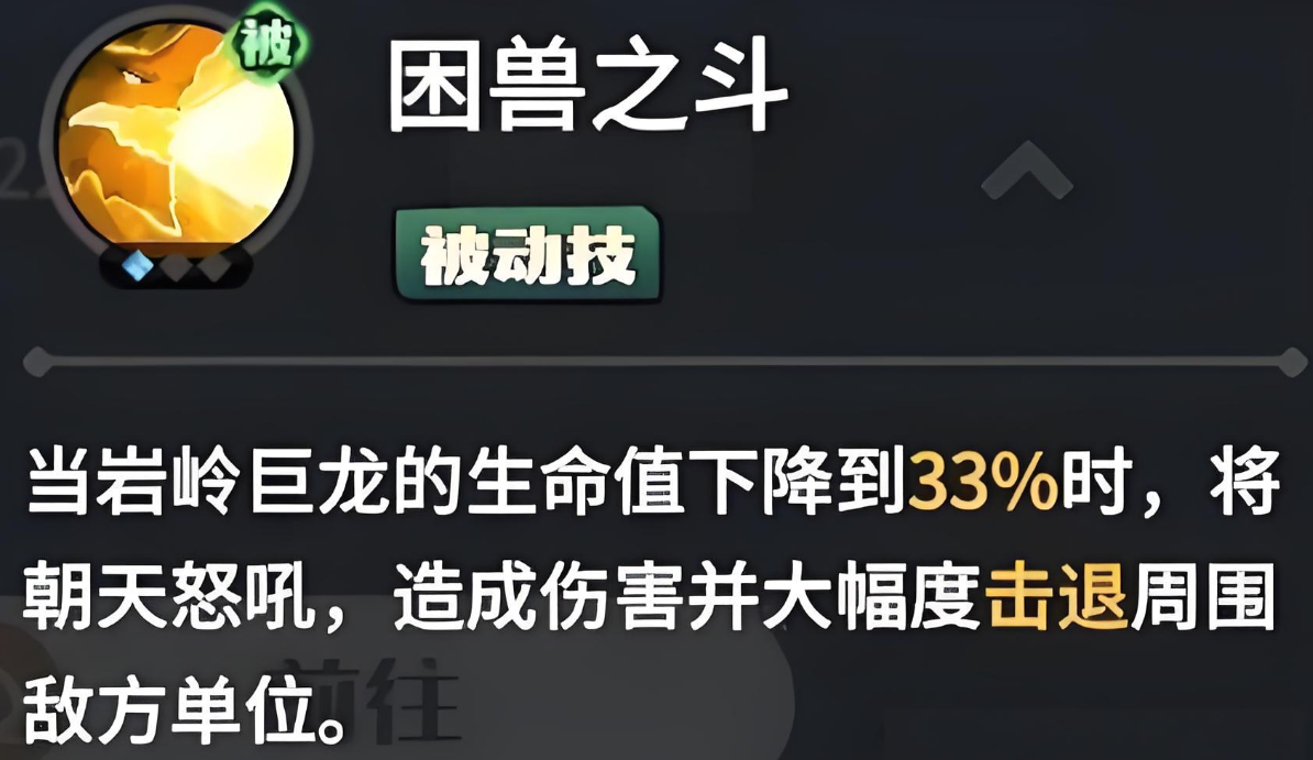 3、岩岭龙这货力气贼大,三个主动技能一个比一个狠。崩山裂地会砸地板,碎岩角站带眩晕,掠食冲锋跑得飞快。被动技能更恶心,血越少攻越高,残血时候得小心别被它反杀。打它得带够奶妈,慢慢磨最稳妥。