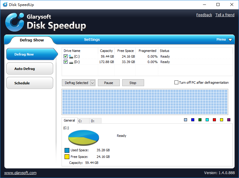 色彩丰富的界面,带有醒目的大型标签和标记为Defrag Show and Settings的选项卡,提供所有基本功能,因此对于新手和专业人士都非常容易操作。