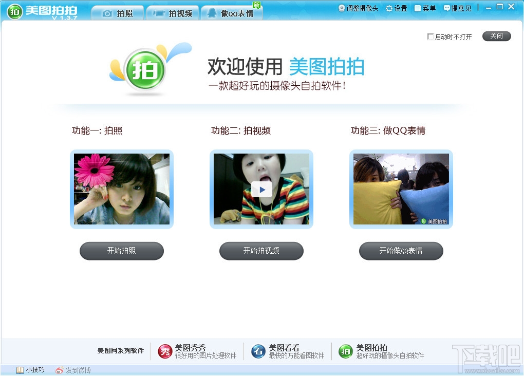 美图拍拍是一款超好玩摄像头自拍软件,完美兼容所有主流摄像头,安装即用无须多余设置及驱动。美图拍拍电脑版把电脑变成了相机和DV,可以轻松自拍大头贴,还能拍视频、做搞笑QQ表情等。有超多可爱素材,还有独家的摄像头优化技术,让你更加上镜哦!想体验摄像头的神奇魔力吗?赶快下载美拍电脑版安装吧