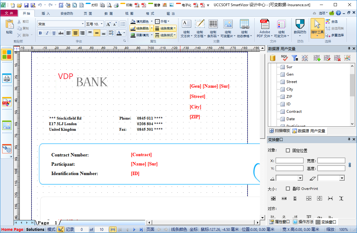 使用SmartVizor 进行模板设计,需要设置数据绑定,打印条件,对于复杂的应用,需要设置特殊的二次打印条件判断。支持所有对象的数据可变和位置可变,以及一些其他的属性可变。