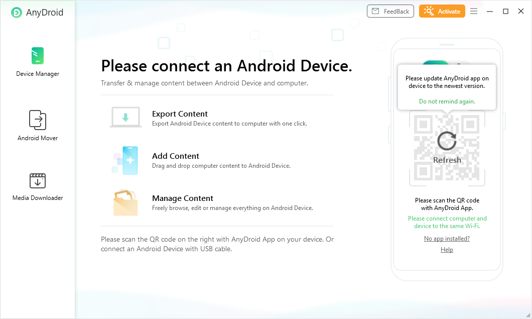 如果您不想打开USB调试选项并在计算机上安装USB驱动程序,请尝试使用Wi-Fi连接将手机连接到计算机。请使用手机上的AnyDroid App扫描以下界面上的QR码。