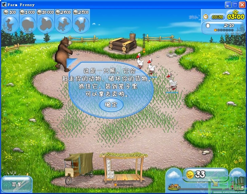 本作的上手指导非常详细,系统会引领玩家操作每一个新增加的项目。过关目标包括购买指定数目的动物,达到规定钱数或制作其他物品的数量,循序渐进的难度逐渐加强。