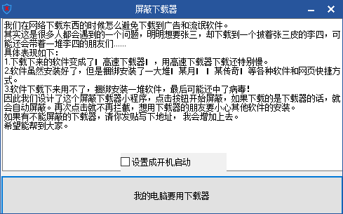 屏蔽下载器是一款由个人打造的下载器屏蔽工具,该工具的主要功能就是帮助用户在进行下载任务时屏蔽下载器,使下载器不能正常工作;不少用户在网站中下载资源时,通常会遇到下载到本地的不是程序本身而是下载器,不明所以的用户当安装下载器后,不仅发现自己想要的程序没有安装上,计算机中还一下多了很多陌生软件,对于用户来说这是一个非常不好的体验,并且安装的流氓软件对计算机还存在一定的风险;通过该工具用户将更直观的甄别下载器,告别流氓软件。