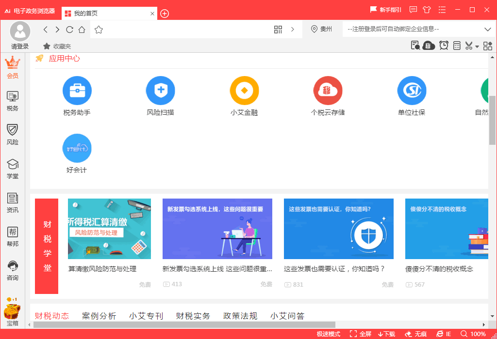 6、登录之后,您可以使用左侧的功能,快速的查看相关的税务资讯和与客服进行相关咨询。