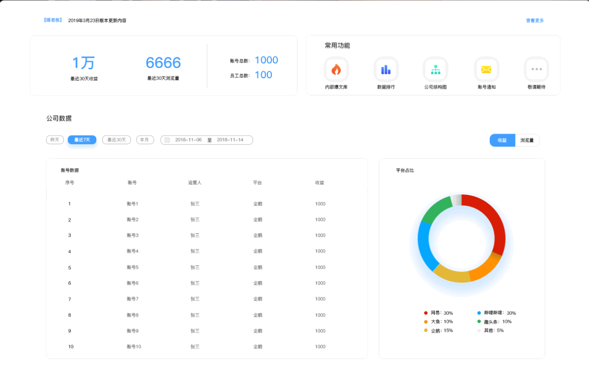媒老板是一款强大的自媒体运营管理软件,该软件可以帮助自媒体运营人员管理账号,运营账号,提升工作效率;由于互联网的普及,自媒体行业也迎来了井喷式的发展,从个人到企业,越来越多的人参与到自媒体创作中,相关的自媒体平台也越来越丰富,像是最为人熟知的大鱼号,头条号,百家号等都拥有不少的自媒体创作用户;要想在那么多平台中做好自媒体,一个强大的自媒体管理工具是必不可少的,而媒老板就是这样的一款自媒体管理工具;该软件拥有丰富的功能帮助您批量化运营自媒体账户,支持大部分主流的自媒体平台,并且提供一系列的账号优化功能,让用户能够高效工作。