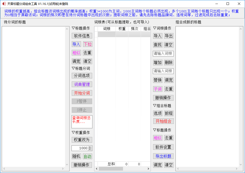天音标题分词组合工具是一款非常专业且操作简单的标题分词组合软件,该软件基于字符串匹配系统词典的方法进行研发,从原始标题里面提取词根再按词根的权重重新组合成新标题,可以帮助用户快速进行标题组合,可有效的防止违规,非常适用各大电商平台进行使用;天音标题分词组合工具支持合理分配词根权重,可以进行有效的标题的优化,同时该软件还支持采集下拉词、相关词等功能,可以帮助用户快速精准的进行高效完美的分词组合操作,非常方便实用。