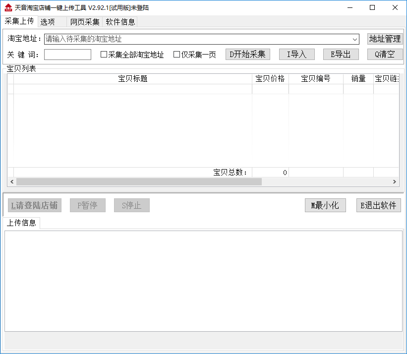 ★可上传任意淘宝店铺(包括各大版本的旺铺、天猫店铺)首页、所有宝贝、店铺分类、店内搜索、单个宝贝、淘宝分类搜索、天猫搜索地址;店铺首页地址可自动识别并跳转;可以选择从第几页到第几页上传;可以设置只上传单页,该功能可采集店铺首页所有窗口的宝贝(包括推荐宝贝);已上传过的淘宝地址在软件内部管理,方便下次查找和上传;支持批量添加宝贝地址上传功能;