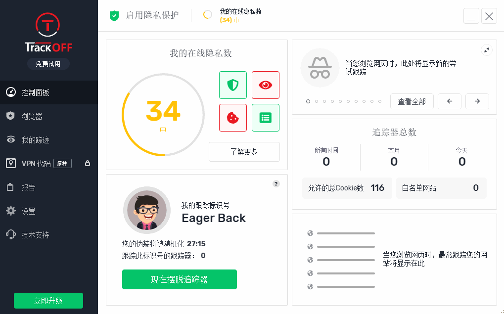 TrackOFF是一款很好的隐私防护软件,它能够有效防止用户隐私泄露,防止恶意程序或者黑客窥探计算机信息;该程序拥有直观清晰的界面,操作简单,可轻松根据个人要求配置各种隐私防护功能;虽然这款软件看上去比较简单,但它实际上采用了许多先进的技术以及复杂的安全防护算法;该软件一方面可以帮助用户检测并阻止任何想要收集用户敏感信息的访问请求,另一方面,它会锁定用户的计算机,以防止用户的计算机受到更多攻击;TrackOFF附带了许多非常容易设置的防护功能,感兴趣的朋友可以下载免费体验。
