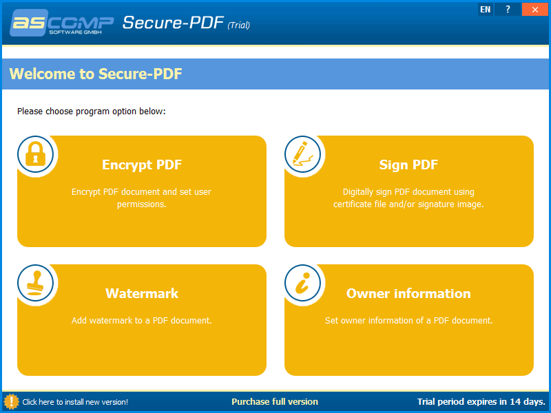 Secure PDF是一款强大的PDF文件加密软件,该软件主要为用户提供安全的PDF文件加密功能,以此来保证PDF文档的安全;PDF文档作为一个常用的办公文档,通常会被用来记录一些重要的文件资料,如果不为其设置一个防护密码,那么重要的文档就很容易丢失或者被他人窥探;这里向大家推荐这款安全的PDF文档加密软件,该软件支持为PDF文档设置不同强度的密码保护,并且允许用户自由设置PDF文档的限制,让其他人不能更改或者移动PDF文档;除此以外,软件还支持在PDF文档中添加各种水印,制作者信息,以及电子签名等,全方位的为PDF提供安全保护。