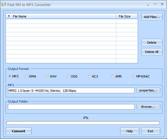 Fast RM to MP3 Converter拥有一个简单的界面,所有功能都在主窗口中整齐地组织起来,可以确保您所需的工作在最短的时间内完成。您要做的就是加载目标文件,选择所需的输出格式和位置,然后开始该过程。