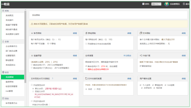 分布式文件存储,基于组织结构的文件夹划分,清晰的分类,丰富的权限配置以及对员工存储容量和空间的警告。