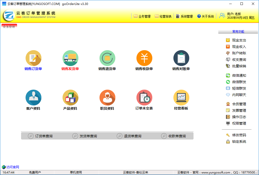 云客订单管理系统体积轻巧、功能强大易扩展、运行快速,拥有完善的订单管理架构,并且采用跨平台数据库,是一款以销售订单为核心的清单订单管理软件,该软件支持销售发货送货、销售对账、职员管理、客户管理等多种功能,可以帮助用户轻松便捷的完成各种订单处理工作;云客订单管理系统功能丰富齐全且操作简单,可以有效提高用户的工作效率和业务管理运作水平,可以搬走用户快速高性价比的进行订单管理收益,协助用户建立规范可追溯的工作流程,非常适合中小微型各行业进行使用。