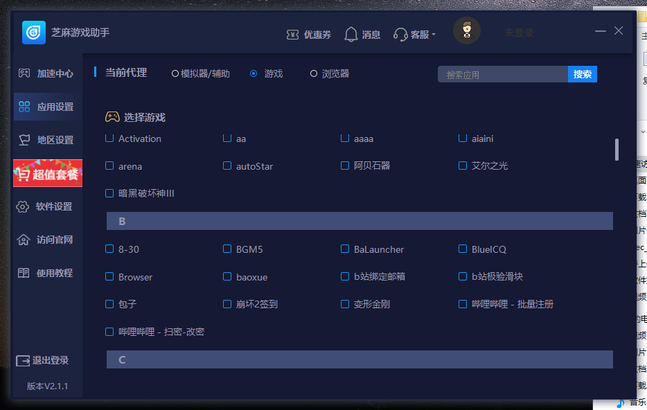 游戏助手使用方法是先应用设置勾选,再打开对应程序,如果勾选前已经打开游戏或者忘记勾选,会代理不上,所以进程列表不显示。