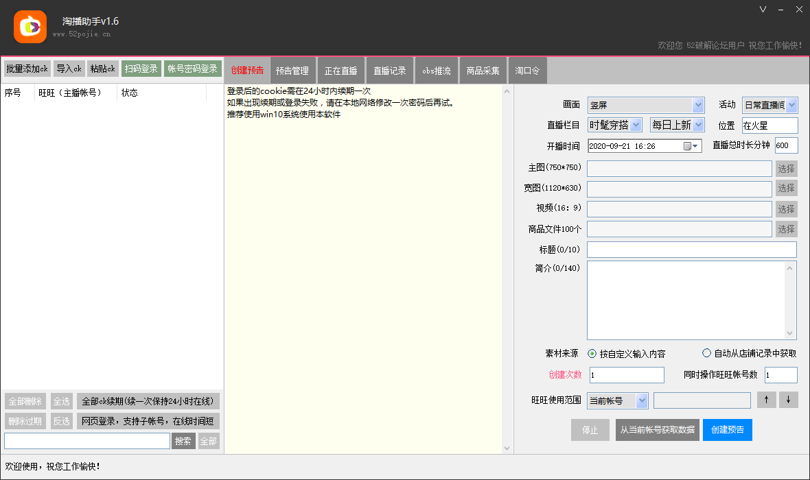 淘播助手是一款功能强大、操作便捷的淘宝直播多帐号多任务管理软件,该软件支持无限多帐号同时操作,帮助用户快速发布预告、同时开播、商品上传等操作;该软件支持宝贝一键上传、自动回复、自动回复等多种功能,让用户可以便捷高效的进行多账号管理,大大提高用户对淘宝直播账号的管理和运维效率;通过淘播助手这款软件,用户可以轻松快速的进行商品采集、淘口令生成和解析等操作,可以说是主播必备的淘宝直播多开助手。
