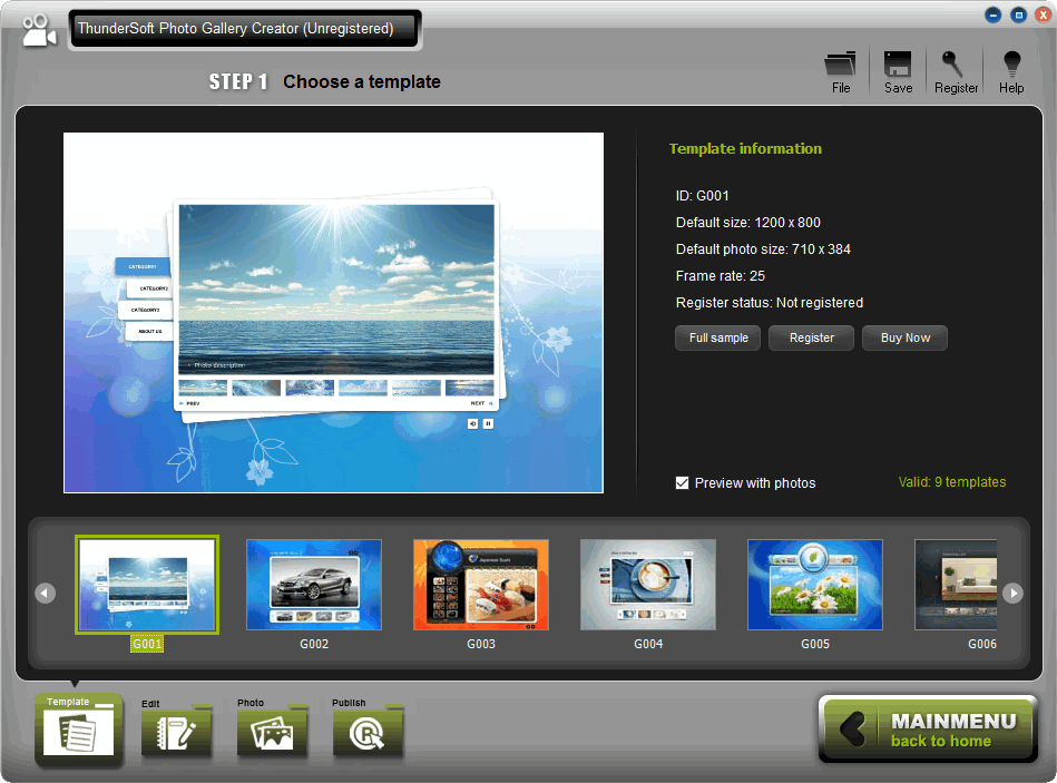 ThunderSoft Photo Gallery Creator是一个简易用的相片视频制作软件,旨在帮助用户在电脑上创建相册视频;该软件内置丰富的过渡效果,并为用户提供适合多种场景的项目模板,用户可以一键选用模板制作相册视频;通过该软件制作的视频可以输出保存为多种常见的视频格式,比如MP4,AVI,WMV,FLV,MOV,MPG,EXE,SWF等等,保证用户可以在任何播放器或者编辑软件中打开视频;ThunderSoft Photo Gallery Creator拥有完善的视频制作流程,这使得那些没有相关技术经验的用户也可以轻松将自己的相片制作成视频。