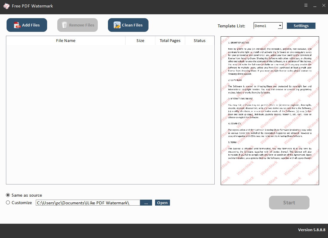 从“模板列表”中选择模板,也可以单击“设置”按钮,演示1和演示2允许您自定义文本,正面尺寸,颜色,不透明度,旋转度和页面范围。演示3使您可以将图像水印添加到PDF。