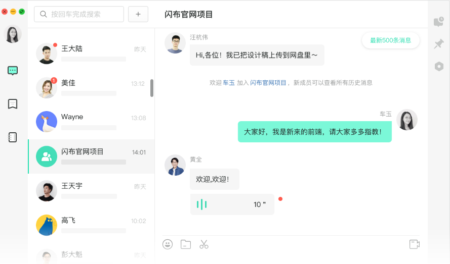 新成员加入群组时可随时随地查看全部历史消息,快速融入团队和项目,降低沟通成本,提升上手效率。