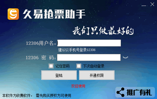 久易购票是一款火车自动抢票助手,用户可以使用该程序轻松抢购火车票,系统自动抢购,无人值守;每到节假日,火车票都会出现一票难求的景象,很多用户守在电脑或者手机边,花费很多的时间也无法抢购到火车票,这让许多用户只能滞留在所在的城市而无法继续进行自己的旅行计划或归家计划;久易购票作为一款自动抢票软件,可以帮助用户自动在12306官网中抢购车票,并支持改签和连续换乘任务设置,这让用户不必花费过多的时间在抢票上,通过这种方式抢到票的概率也比用户手动抢票的概率大,感兴趣的朋友可以下载体验。