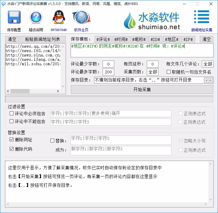 水淼门户新闻评论采集器是一款非常专业且优秀的新闻评论采集软件,可帮助用户快速将新闻评论进行采集,非常适合从事新闻工作的朋友们,可采集多个平台的新闻评论,如腾讯、凤凰、新浪等,可采集本日、本周、本月不同时间的新闻评论,支持自定义保存模板,您可以采集特定样式的评论,比如某个地区某位叫什么什么的网友在何时的评论,采集的时候就会安装这个模式进行采集,使用起来非常方便,可自定义设置保存目录,将采集到的新闻评论保存在指定位置,便于使用,欢迎有需要的用户下载体验