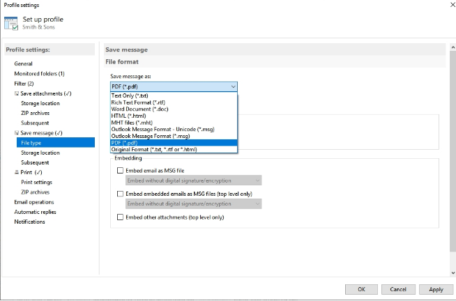 3、支持电子邮件保存格式自定义设置,例如可以将电子邮件保存为PDF、HTML、doc、TXT等文件