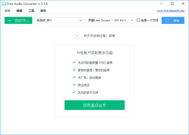 DVDVideoSoft Free Audio Converter是一款音频格式转换工具,它可以使用户在多种音频格式之间进行音乐格式转换,轻松转换电脑中的音频文件;该软件拥有多种易于配置的音频输出设置,可用于多种音频格式,支持批量转换音乐文件,并可以将多个文件合并为一个音乐文件;软件的使用方式非常的便捷简单,用户只需要将音乐文件拖放到程序中,选择好合适的音频格式就可以一键输出为指定的音乐格式;不过软件有一个缺点,就是名称与实际效用不符,名称翻译为“免费的声音转换器”,可事实上该软件却需要付费才可以使用。