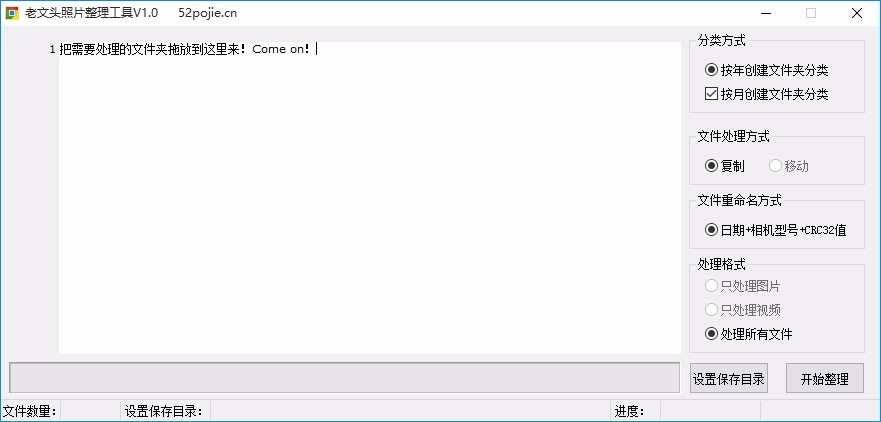 老文头照片整理工具是一款非常简单且实用的照片整理软件,可帮助用户快速将照片进行整理,当电脑中存储的照片过多时,则会显得杂乱无章,也不太好查找需要的照片,这时候就可以用到这款软件,具备简洁直观的操作界面,旨在为用户提供一套最简单的照片整理方案,提供不同的分类方式,可将照片按年或者按月创建文件夹分类,可清楚的了解照片拍摄的时间,支持复制或移动文件,便于进行整理,还可将文件以指定的方式进行重命名,这么好用的软件,赶快下载试试吧!