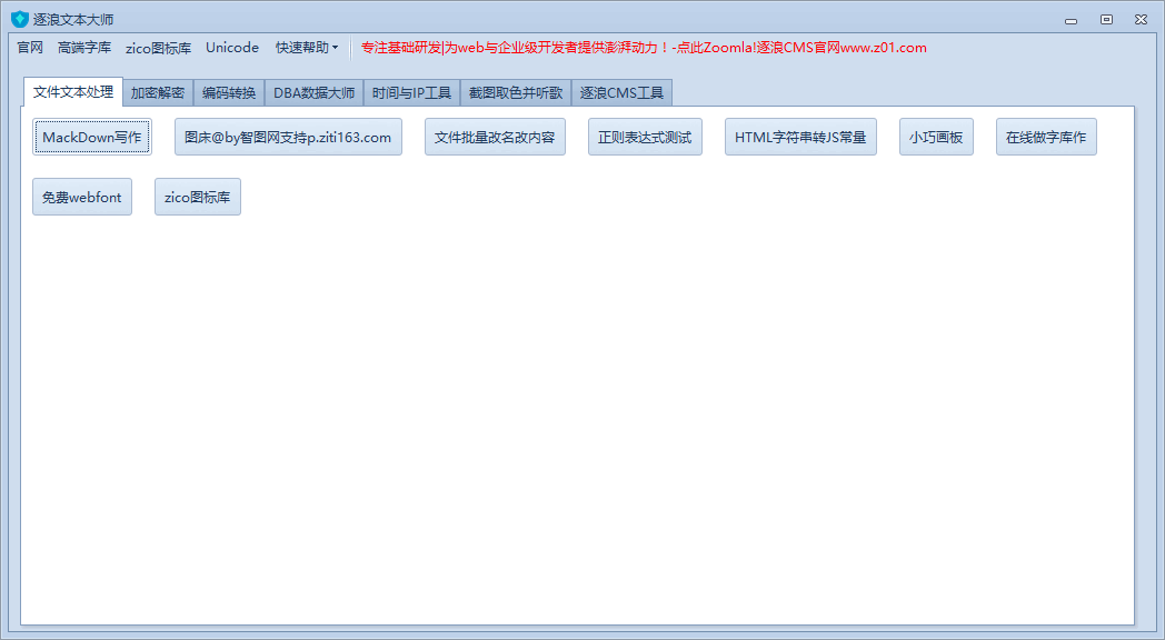 逐浪文本大师是一款多功能的开发者工具箱,在这里用户可以使用各种逐浪开发工具,包括文本编辑,文件名修改,截图取色,文本加密等等;对于网页前端开发用户来说,需要使用到的工具非常多,通常情况下开发者会在电脑中安装各种开发辅助软件,当用户需要使用对应的工具时,不仅比较难查找,还在无形之中给计算机造成一定的压力,使计算机的运行速度降低,同时也降低用户的项目开发效率;这款逐浪文本大师将开发者需要使用的大部分工具集中在一个界面中,并进行分类,让开发者可以轻松的查找并使用相关的开发工具。