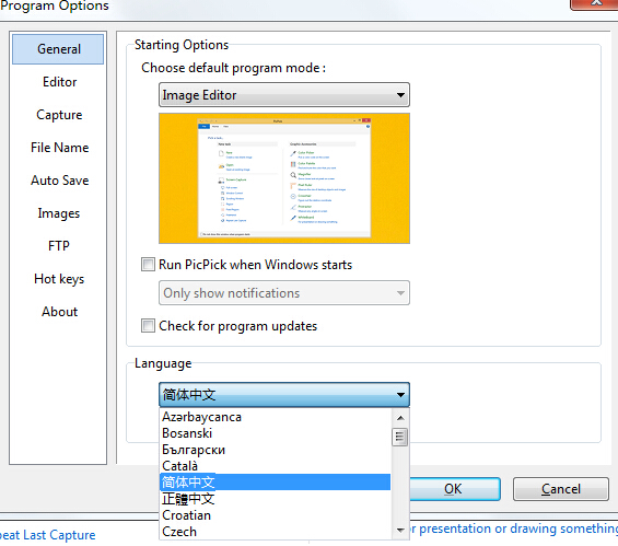 PicPick截图软件设置中文方法:点击菜单栏的“File”,然后选择“Program Options”,在“Language”上选择“简体中文”,即可。