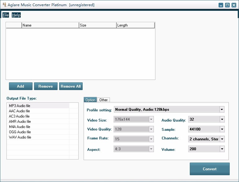 此外,您可以在质量,采样频率,通道模式和音量方面修改音频设置,以及从列表中删除一项或清除整个队列,并使Aglare Music Converter Platinum自动关闭音频设置。或在编码后打开输出目录。