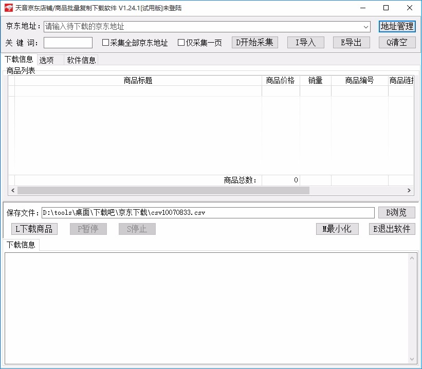 天音京东店铺/商品批量复制下载软件是一款非常专业且优秀的京东店铺/商品批量复制下载工具,可帮助用户快速将京东地址的店铺或者商品进行复制并下载,如果您需要批量下载京东商城内的商品,就可以用到这款软件,您可以将京东地址复制到软件,即可快速下载该地址下的商品,下载完成后,可查看下载的商品总数,还可查看商品的详细信息,将这些商品下载到指定的位置,便于后续使用,下载的过程中,可实时查看下载的进度,多线程下载,这么好用的软件,赶快下载试试吧!
