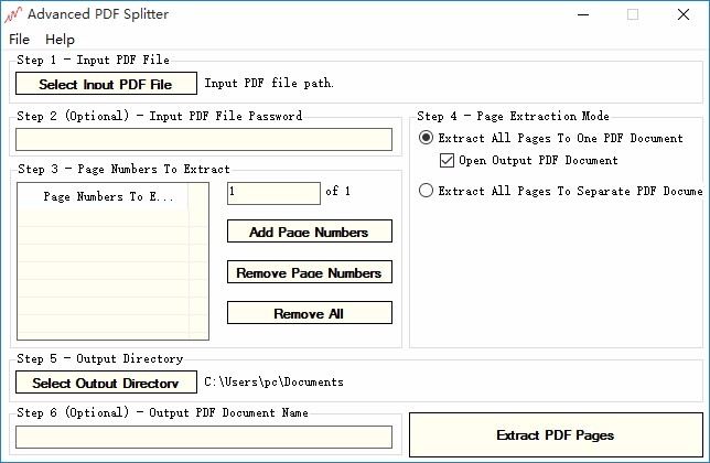 该工具不支持PDF预览选项,因此您需要使用第三方查看器手动打开内容并标识要提取的页面。